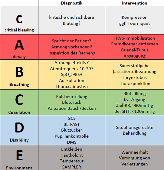 - C: Kreislauf - Hier geht es um die Kreislaufsituation des Patienten – die Verteilung des Blutes im Körper. Wird der Kreislauf aufrechterhalten, oder gibt es Anzeichen für einen Schock (z.B. durch Blutverlust)?